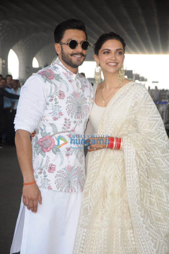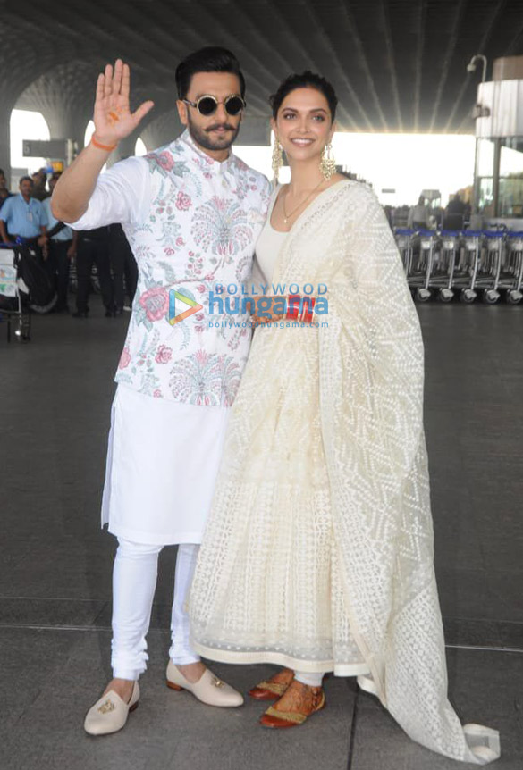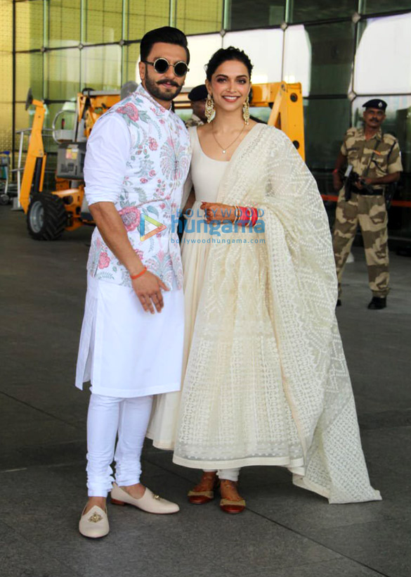 Ranveer and Deepika were all smiles this morning at the Mumbai airport as they headed to her hometown. Both of them colour coordinated in white as they posed for the paparazzi. Ranveer Singh teamed up a kurta and pyjama with a printed Nehru jacket. Deepika looked beautiful as a new bride in a white anarkali dress. Both of them were dressed in Sabyasachi Mukherjee outfits as they smiled for the shutterbugs.